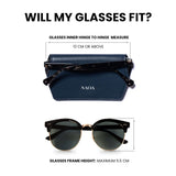 If you have very large sunglasses kindly measure the height of your frames, if bigger than 5.5 cm they will likely not fit our case properly.